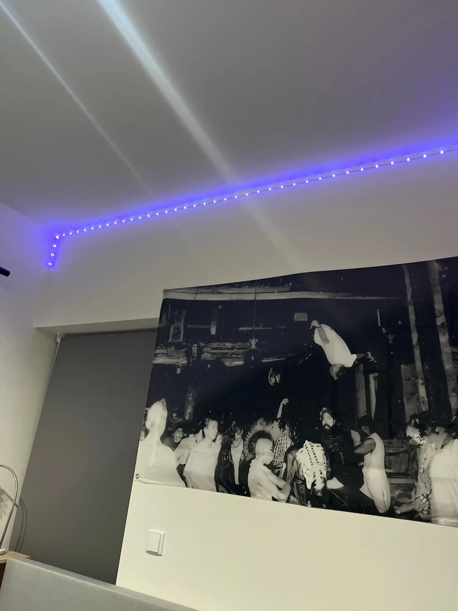 For this price, it's a great tape. It works through the app, there are no batteries in the remote. The app sometimes lags, but again, for this price it's just nitpicking. It sticks well with double-sided tape and doesn't get very hot. It arrived quickly. The light colors all blend into shades of white. The brightest colors look beautiful. In the photo - red, pink, blue, green, and yellow.